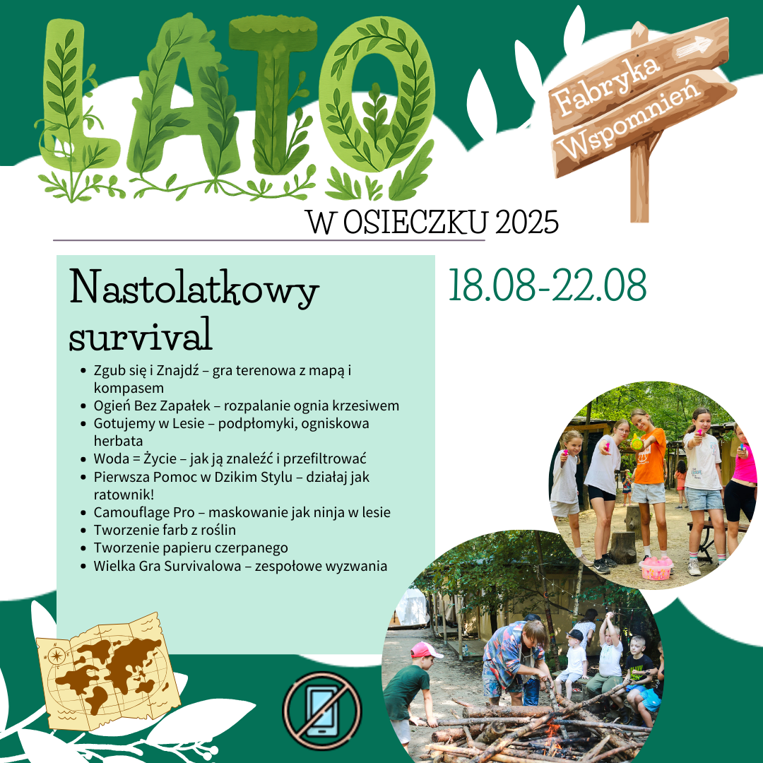 Nasza baza w Osieczku, położona w Dolinie Rzeki Jeziorki, pozwala dzieciom doświadczać przyrody z bliska – w lesie, na łące, przy strumieniu. Organizujemy wyprawy terenowe, podchody, gry terenowe i survivalowe wyzwania. To czas na kontakt z naturą, ruch na świeżym powietrzu i zachwyt nad światem wokół.
